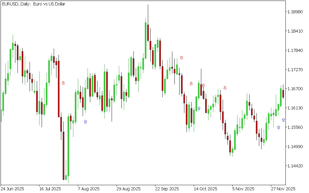 - Bearish crossover → Red arrow + diamond (SELL signal)