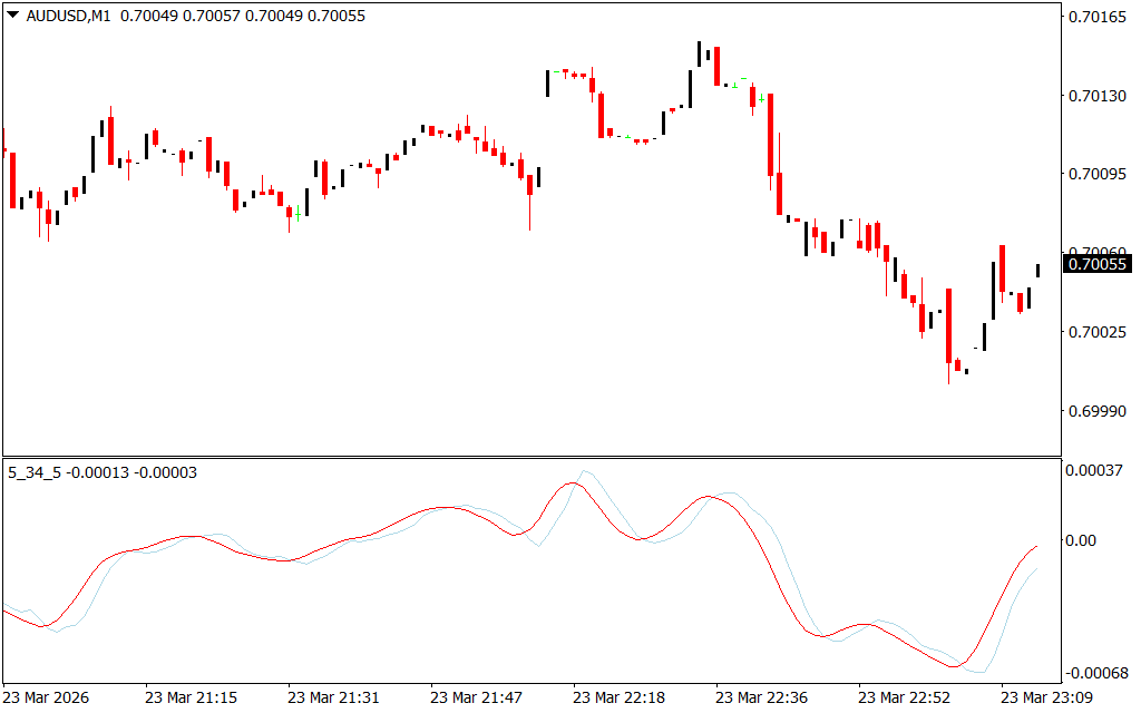 The 5 34 5 Oscillator Indicator for MetaTrader 4 (MT4) is a refined version of the classic Awesome Oscillator (AO). Unlike the traditional histogram display, this indicator uses smooth signal lines to provide clearer and earlier insights into market momentum.