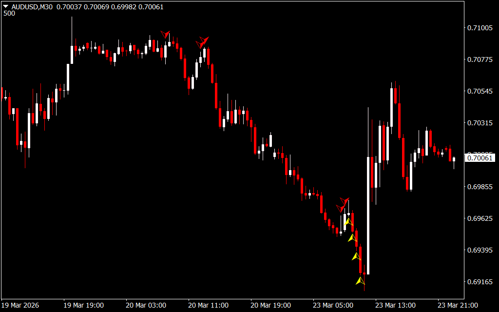 After five consecutive candles in one direction, the indicator signals a possible reversal. In strong trends, multiple signals may appear in the same direction, so confirmation is essential.