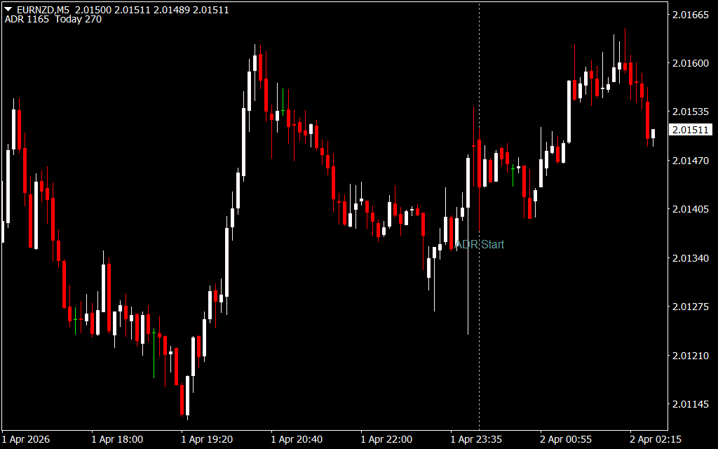 The Average Daily Range (ADR) represents the average distance between the daily high and low prices over a selected period. This indicator uses data derived from the Average True Range (ATR) to calculate expected price movement.