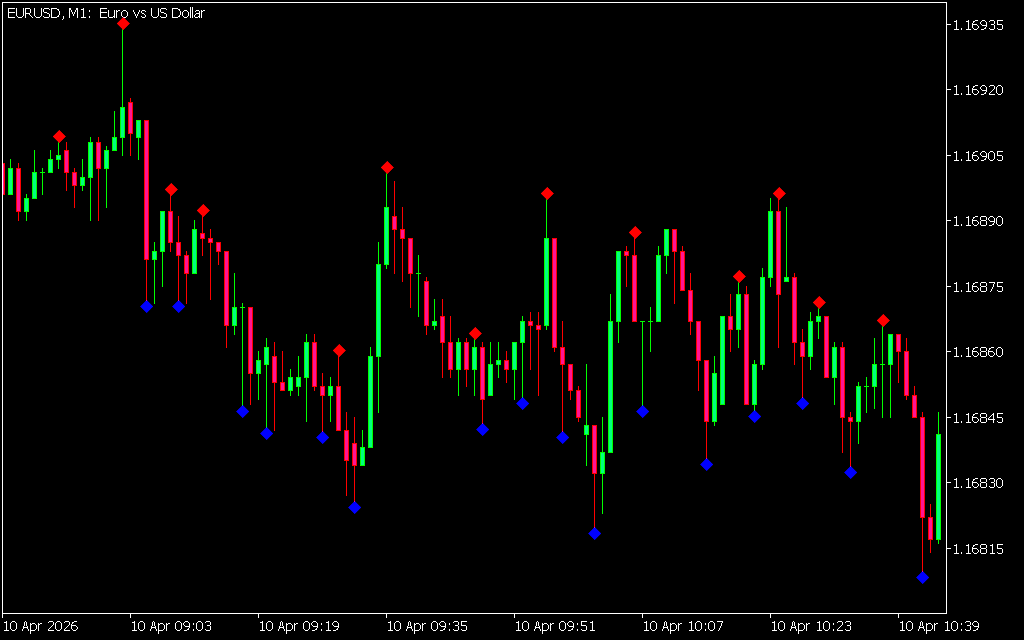 Fractals provide one of the simplest methods for identifying potential price reversals. The indicator marks these reversal points using visual signals directly on the chart: