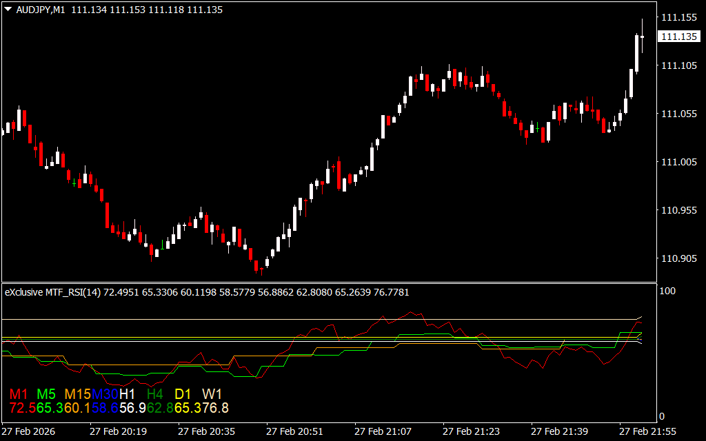 - If you are on the M15 chart, the indicator will display RSI values from H1, H4, Daily, and Weekly.