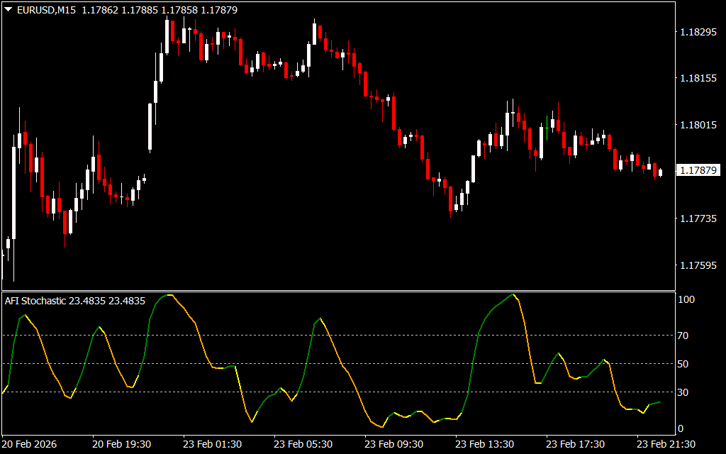 The AFI Stochastic Indicator generates signals based on its position relative to predefined overbought and oversold levels: