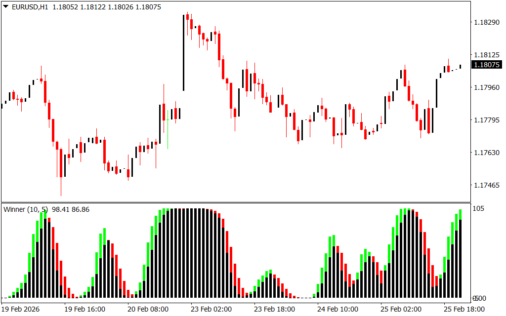 The AFL Winner Indicator displays data as histogram bars that change color and size according to market momentum. Green bars indicate bullish momentum, while red bars signal bearish conditions. The size of each bar reflects the strength of the current trend—larger bars suggest stronger momentum. By observing shifts in the histogram’s color or direction, traders can spot potential reversals, making it easier to determine when to enter or exit trades.