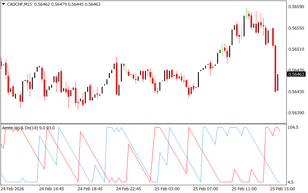 - Dual Oscillating Lines: Aroon Up (blue) signals upward trends, and Aroon Down (red) signals downward trends.