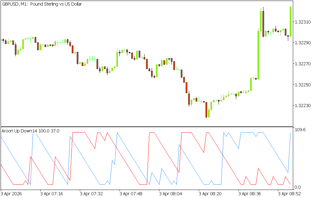 - Dual-Line System: Blue line for Aroon Up, red line for Aroon Down.