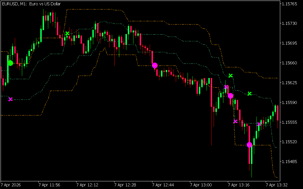 The Arrows Curves Indicator for MT5 is a momentum-based trading tool that identifies breakout signals using dynamic price channels. By drawing two green and two orange lines around price movement, the indicator creates a channel-like structure that acts as dynamic Support And Resistance. In addition, it provides visual breakout signals with circles and crosses, helping traders spot bullish and bearish momentum shifts.