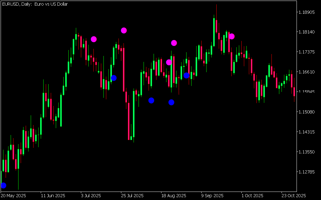 - Sell Signal: A magenta circle appears, signaling a bearish reversal zone. Traders may enter short positions in line with the downtrend.