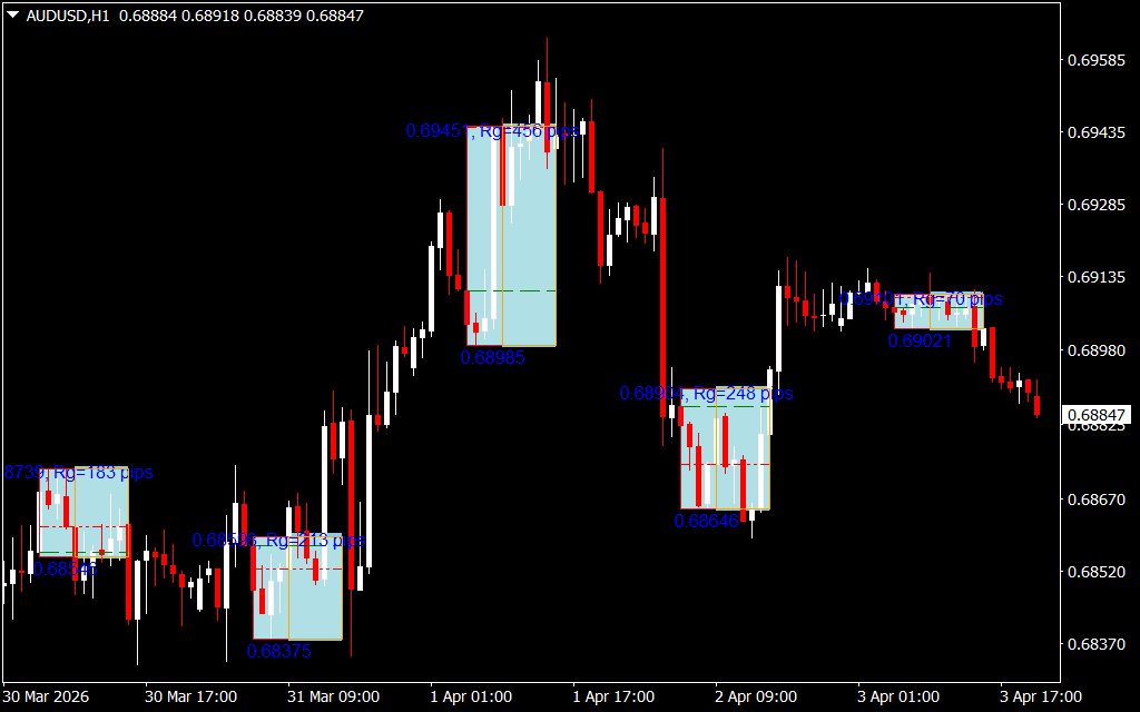 The indicator displays the price range in pips directly on the chart and plots colored boxes to mark the breakout zone. Traders can then interpret these signals as follows: