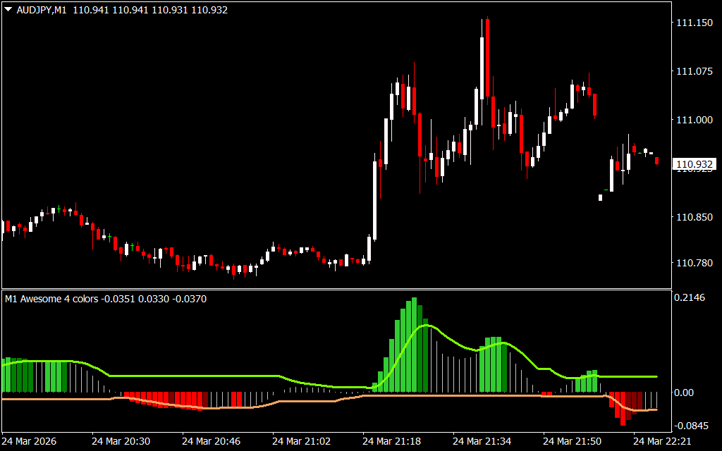 The Awesome Accelerator Four Color Alert Indicator builds on the standard Awesome Oscillator concept. It adds: