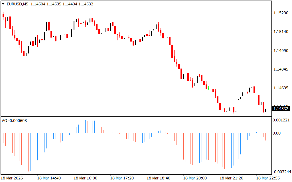 The Awesome Oscillator displays histogram bars that fluctuate above and below a zero line. These bars represent the strength of market momentum.
