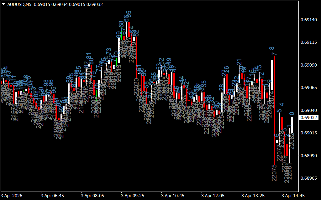 The indicator plots numbers directly on the candles: