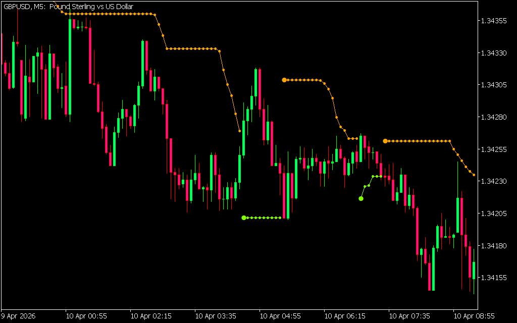 The indicator follows price movement and places a dynamic support/resistance trendline on the chart.