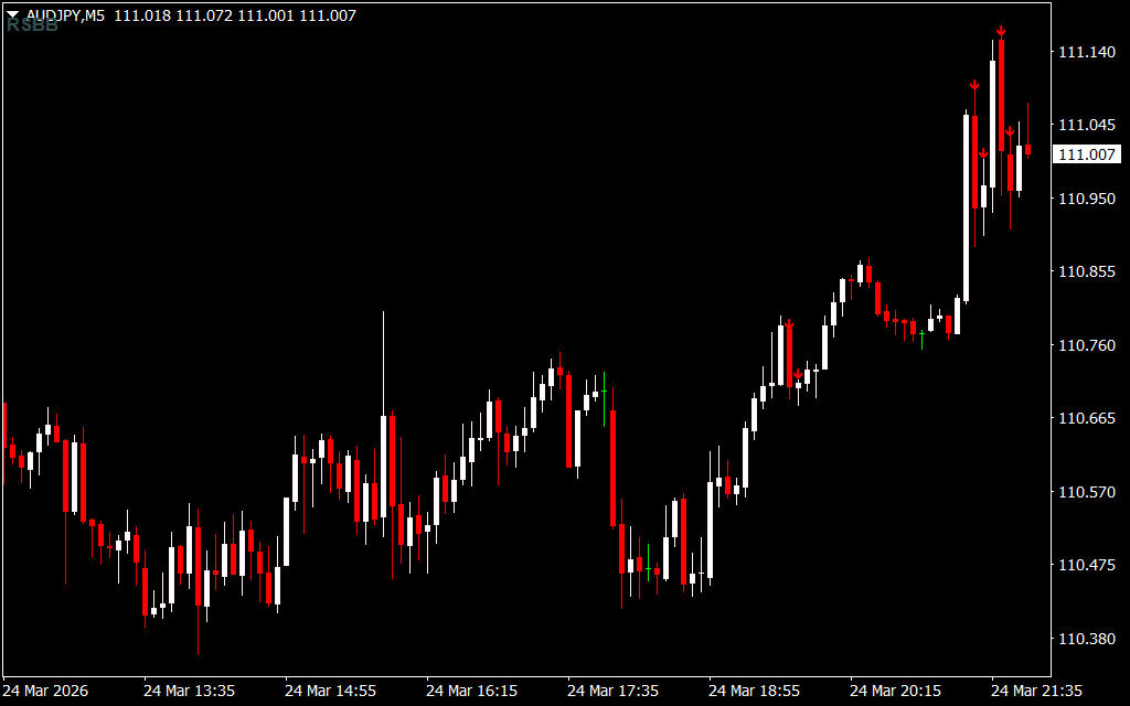- Red Arrow: Appears when price hits the upper Bollinger Band and RSI enters the overbought zone