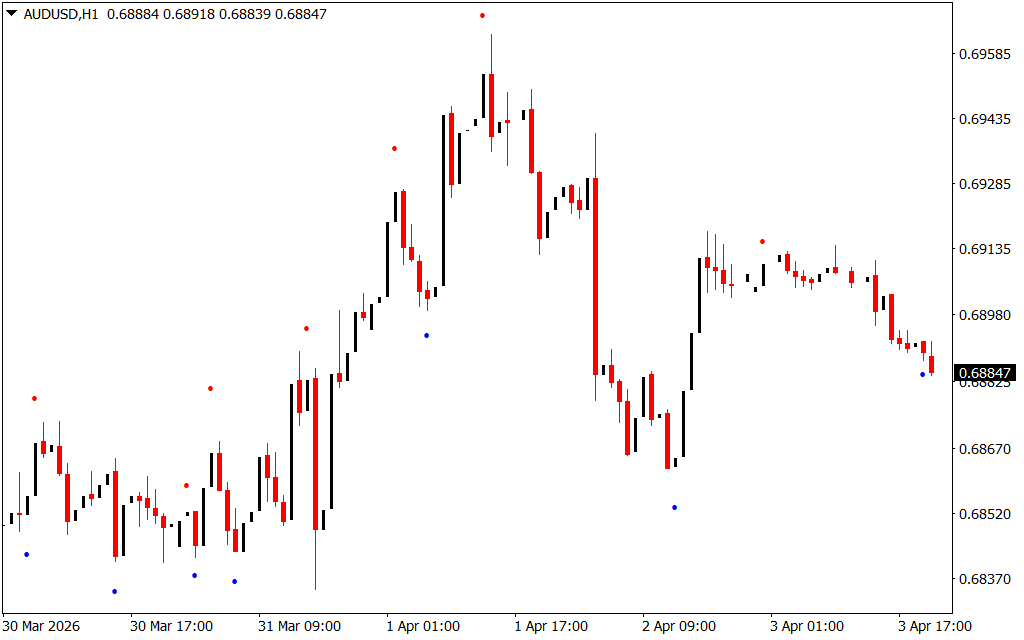 The indicator marks swing highs with red dots and swing lows with blue dots. These dots represent pivotal zones in the market: