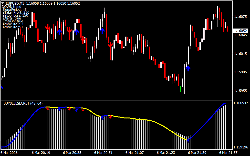 - Arrows appear both on the main chart and in a separate signal window, providing confirmation from two sources.