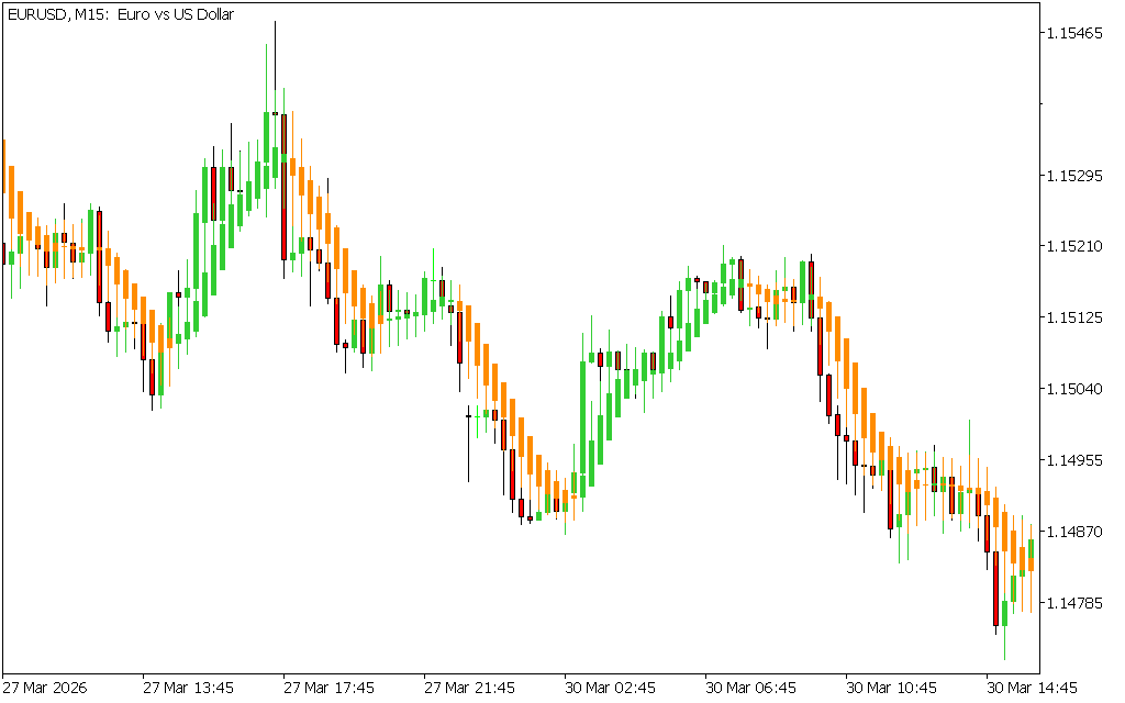 On a EUR/USD chart, green candles appeared during an uptrend, signaling buy opportunities. Later, orange candles formed near resistance, confirming bearish entries aligned with the Trend Reversal.