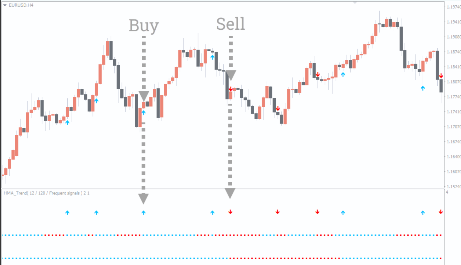 - Uses the traditional HMA to smooth Price Action and detect trend shifts.