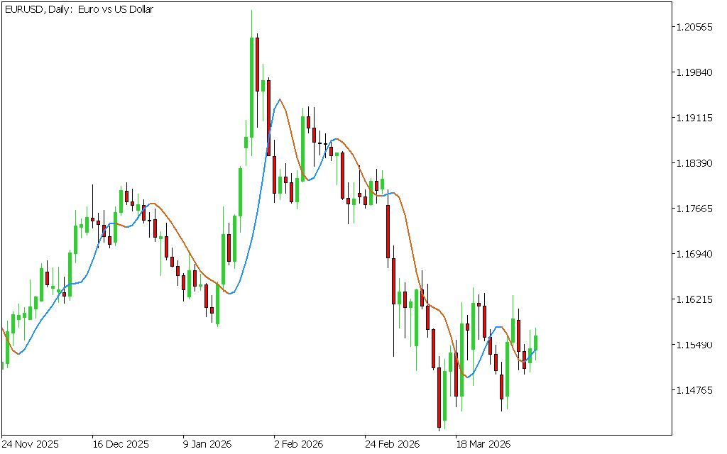 The indicator displays a blue and orange line on the price chart. Trading signals are generated based on the interaction between price and the indicator line: