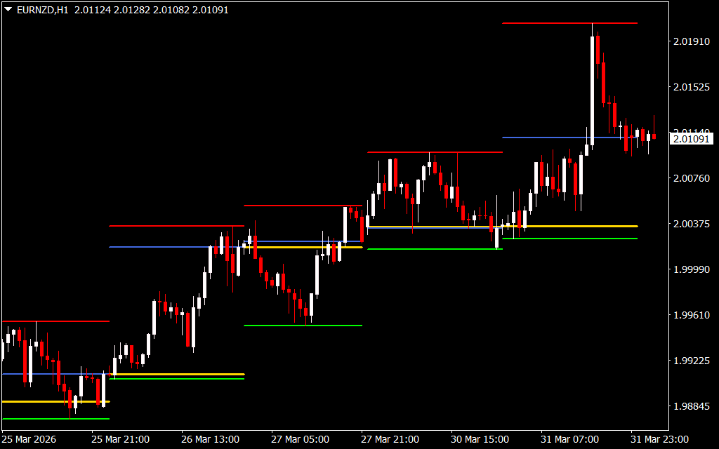 The Bigger TF OHLC Indicator for MT4 automatically identifies and plots the Open, High, Low, and Close (OHLC) values of higher time frame market sessions directly on the current chart. This allows traders to anticipate market trends, as prices often continue the previous day’s trend into the next session.