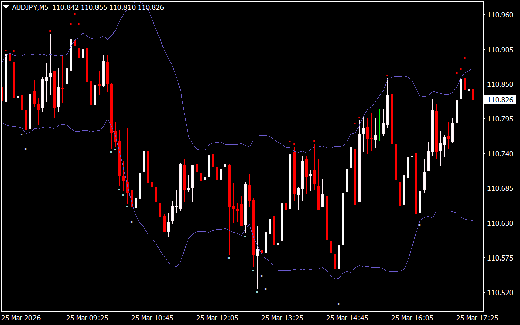 - A blue Bollinger band is plotted on the price chart for easy visual reference