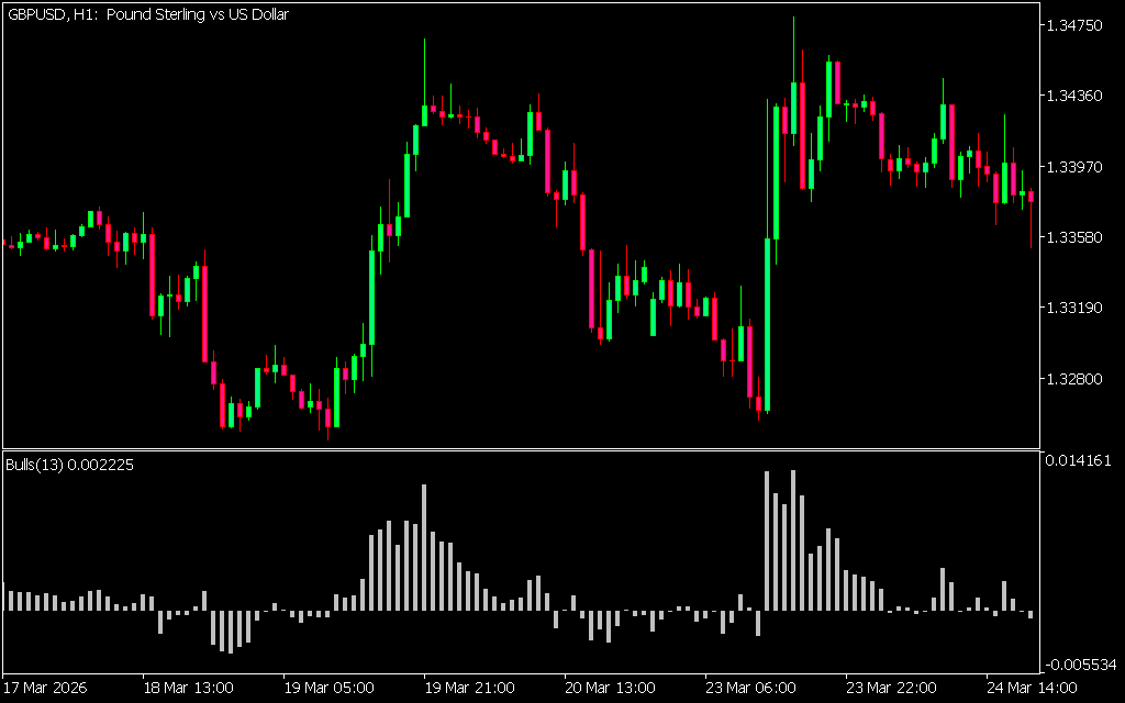 The Bulls Power Indicator evaluates the difference between price and a moving average to estimate buying pressure. When buyers dominate the market, price tends to move above recent highs and the indicator reflects strong bullish momentum.