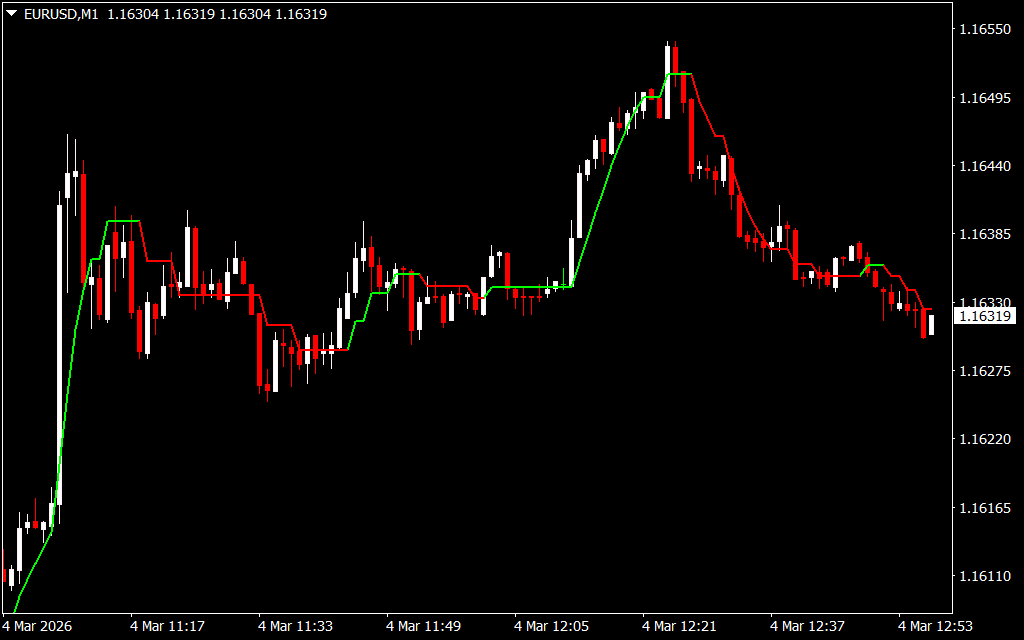 When applied to a pair like EURUSD on the H4 timeframe, the indicator line acts as both a trend filter and entry trigger.