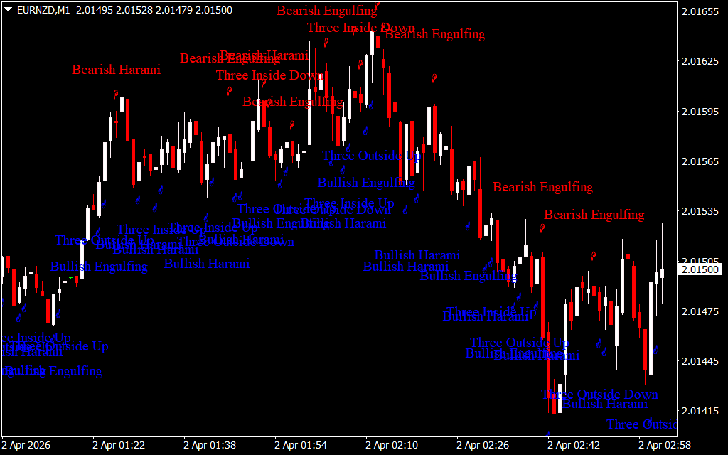The indicator will automatically highlight candlestick formations. Here’s how the main patterns work: