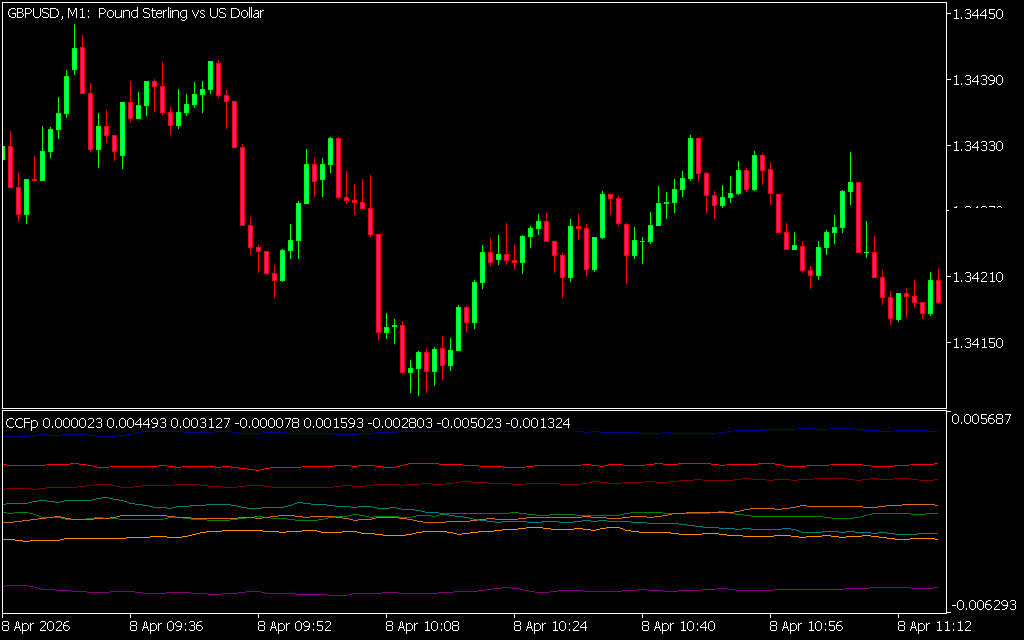 The CCFp indicator compares the strength of the base currency against the quote currency: