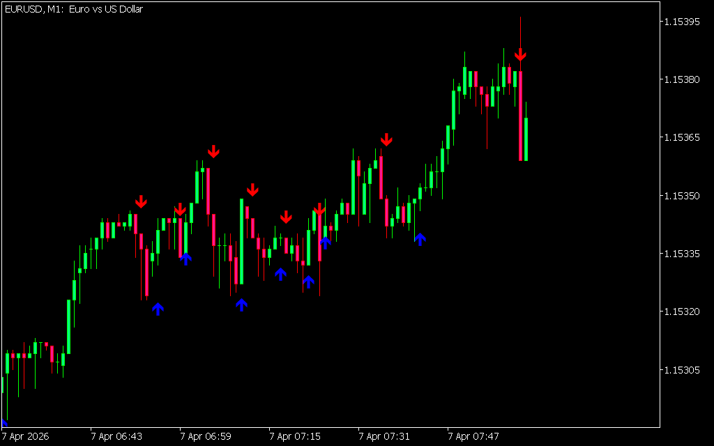 - Arrow-Based Signals: Displays blue arrows for buy signals and red arrows for sell signals.