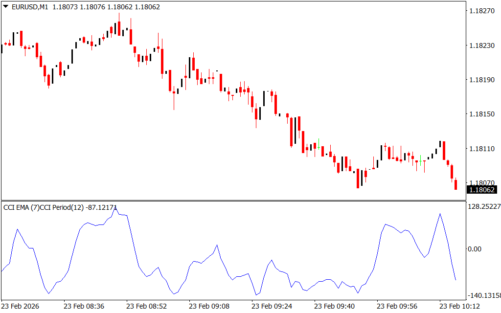 The indicator applies an EMA directly to CCI values, creating a smoothed signal line that reflects the underlying momentum trend. This structure allows traders to evaluate both: