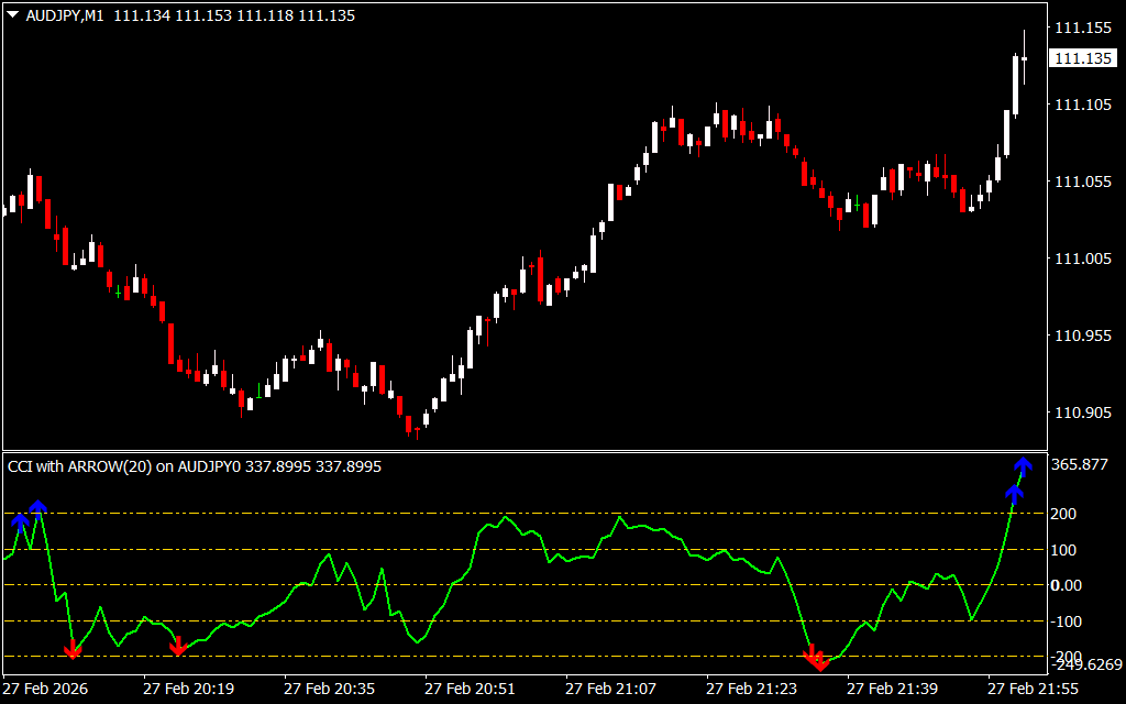 The CCI with Arrow Indicator for MetaTrader 4 (MT4) is a momentum-based trading tool built around the Commodity Channel Index (CCI). It enhances the standard CCI by adding visual buy and sell arrows, making trade entries easier to identify.