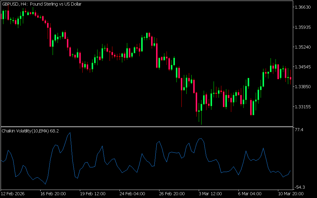 On an MT5 chart, traders can use Chaikin’s Volatility Indicator to spot divergences between price and volume. A bullish setup occurs when the accumulation/distribution line breaks higher, while a bearish setup occurs when it breaks lower.