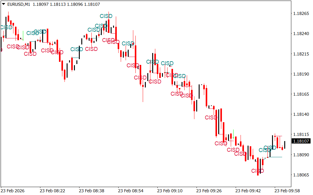 - Teal “CISD” Label – Appears when price shifts from bearish to bullish delivery, signaling potential buyer control.