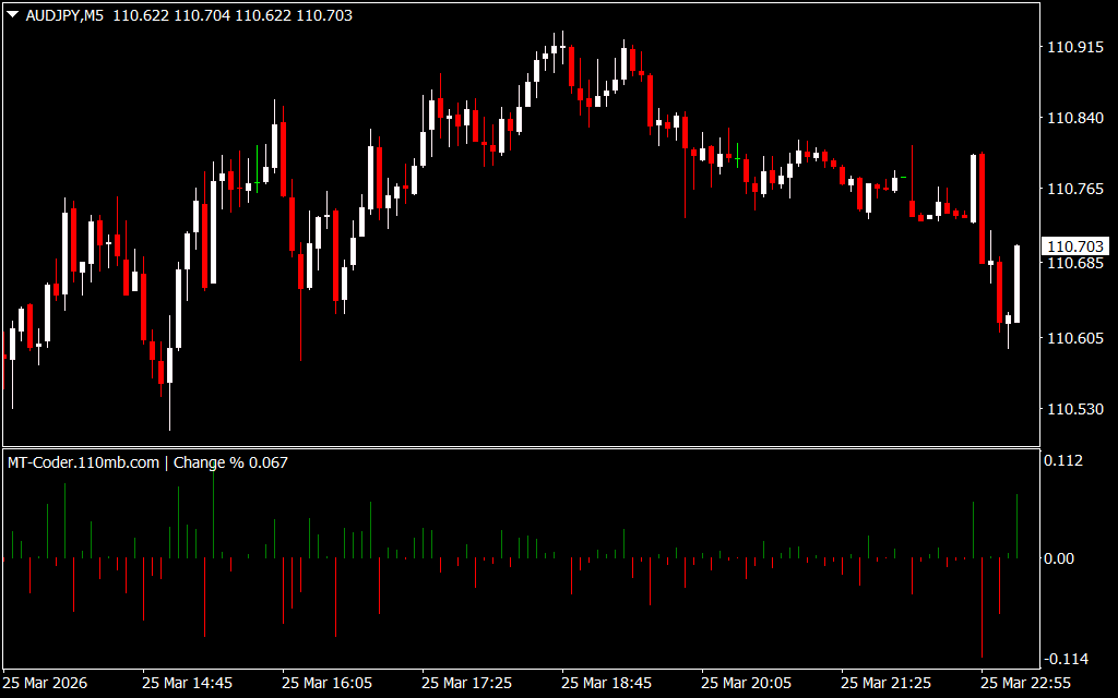 - The indicator plots bars on the chart representing the percentage change in price over the chosen period.