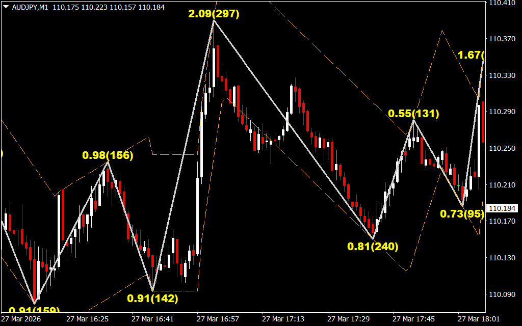 - ZigZag Line (Gray) – shows price swings according to the classic ZigZag algorithm