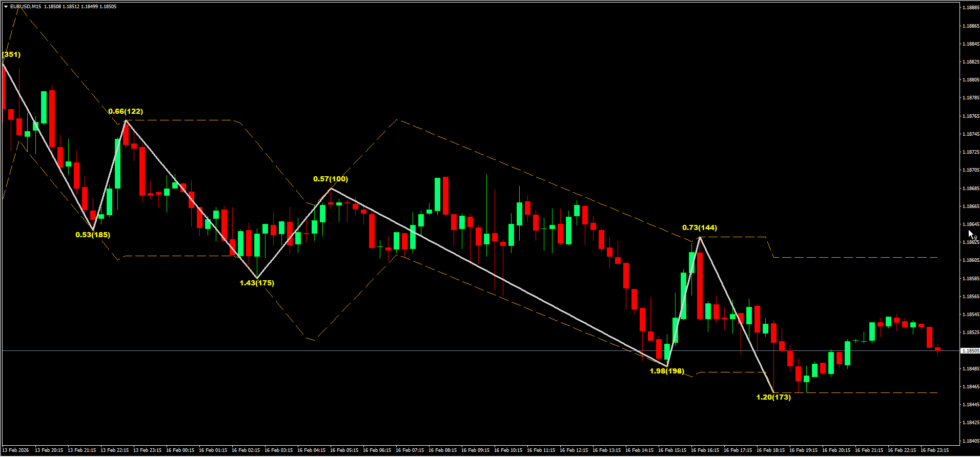 Additional technical information is provided, including the length of completed ZigZag sections in pips and the ratio between consecutive sections. This helps gauge Trend Strength and momentum, giving traders a better understanding of market dynamics.