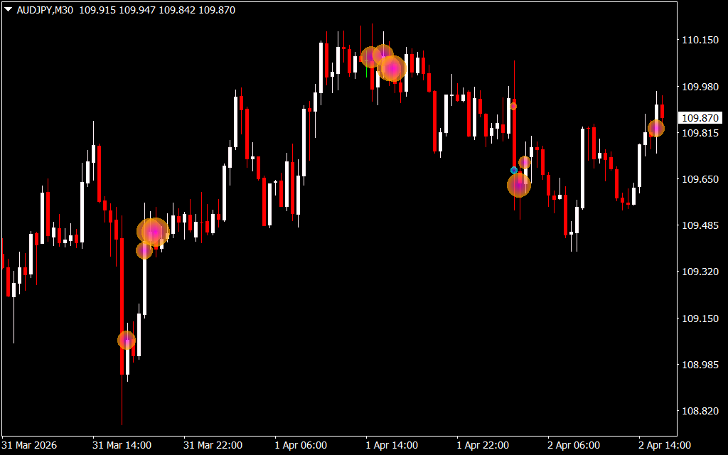 The indicator highlights price levels where trading volume meets or exceeds a specified threshold. When this happens, circles of varying sizes are plotted directly on the chart:
