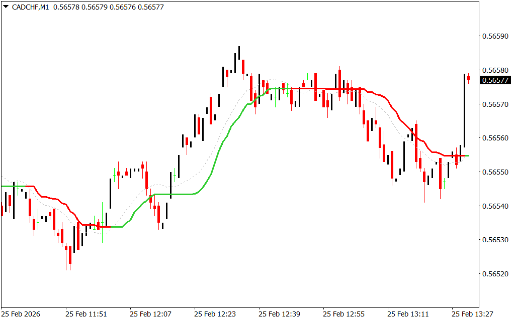 The CMA Indicator applies a moving average calculation that adapts to price movement. When upward pressure dominates, the line turns green, reflecting bullish momentum. When selling pressure increases, it turns red, signaling bearish conditions.
