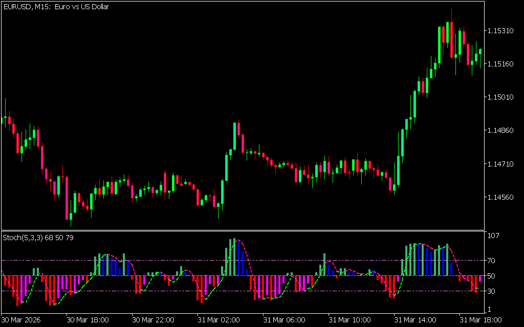 The Color Stochastic Indicator for MT5 is a modified version of the traditional stochastic oscillator. It functions as a Momentum Indicator that compares the closing price of an asset to its price range over a specific period. By adding color-coded signals, it simplifies the identification of potential reversal points, making it beginner-friendly and effective for experienced traders alike.