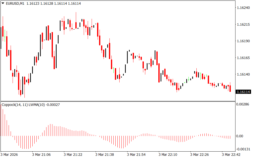 The Coppock Indicator calculates momentum using ROC and plots histogram bars that oscillate around the zero line.