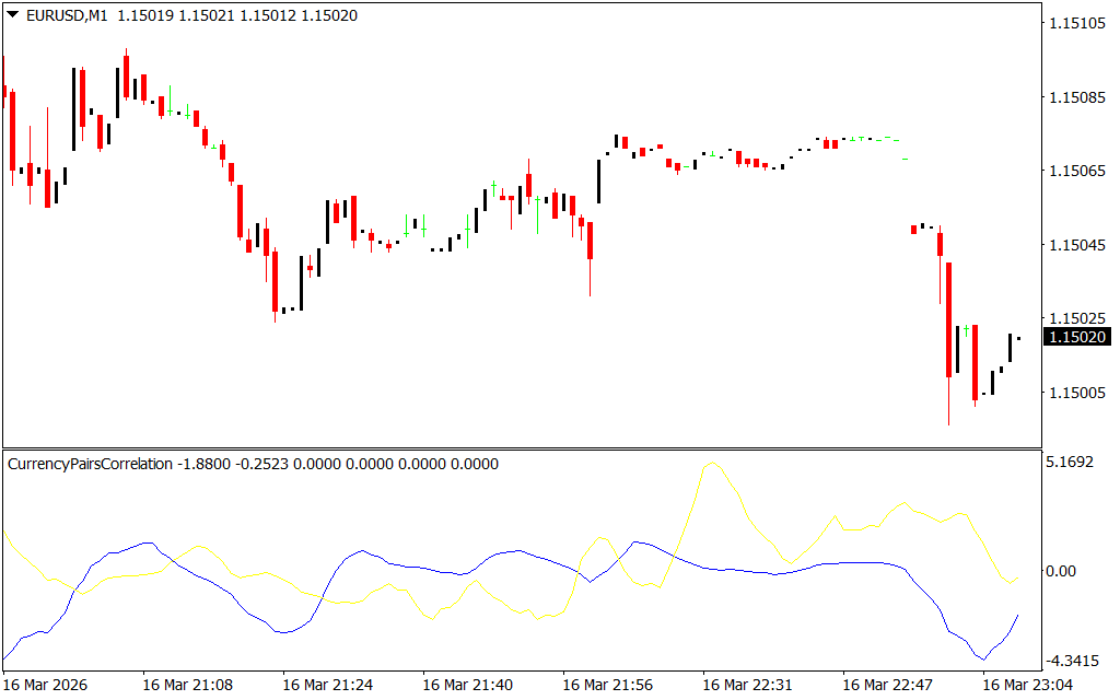 For example, on an EURUSD chart, the indicator can compare the correlation between EURUSD and USDCHF, which are typically negatively correlated. When the histogram changes color, it signals a potential shift in the correlation or trend direction.