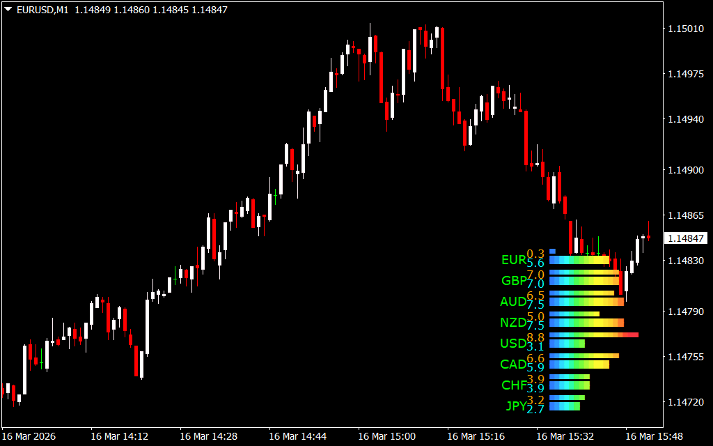 - Narrow Histogram → Shows currency strength on the current timeframe