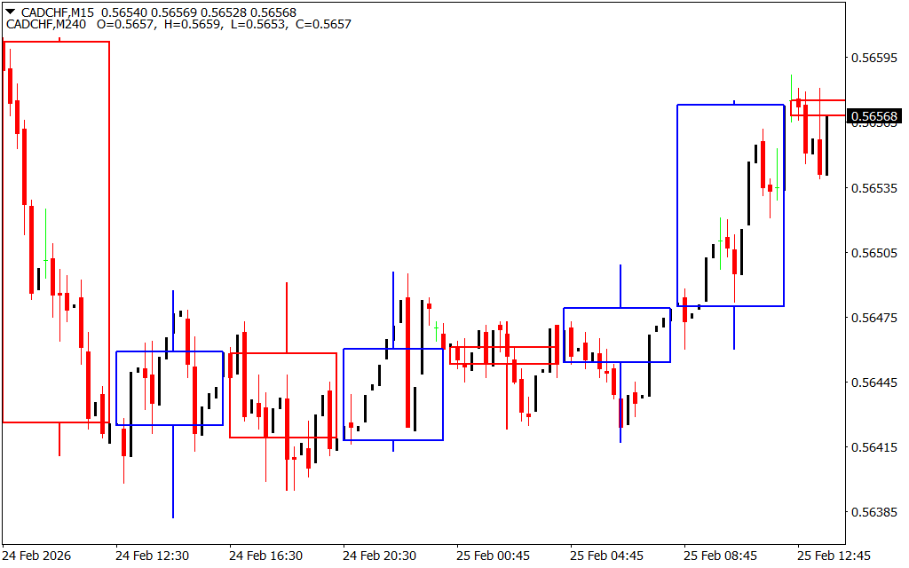 The indicator displays candles from a selected higher time frame on your lower time frame chart, providing a broader market view without cluttering the workspace.