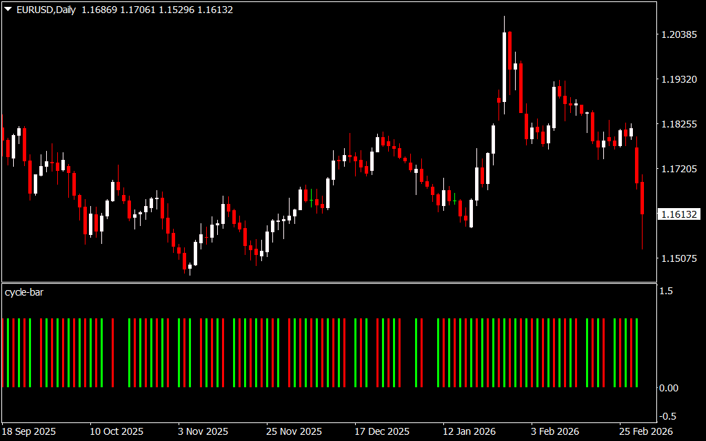 The Cycle Bar Indicator for MT4 is a momentum-based tool that plots colored bars in a separate window below the price chart. The indicator combines Simple Moving Average (SMA) and Relative Strength Index (RSI) calculations to determine the current market cycle and momentum direction.