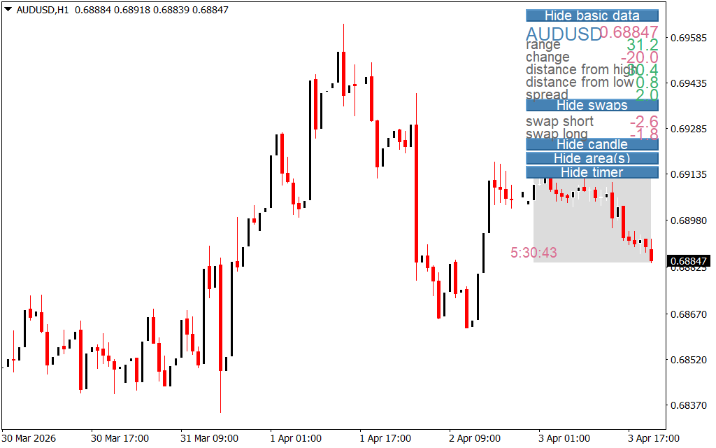 The indicator displays all information in a panel on the chart, which can be customized via input settings. Traders can use the spread, swaps, and distance from high/low to evaluate potential trade setups. Additionally, the candle timer provides precise timing for entries and exits.