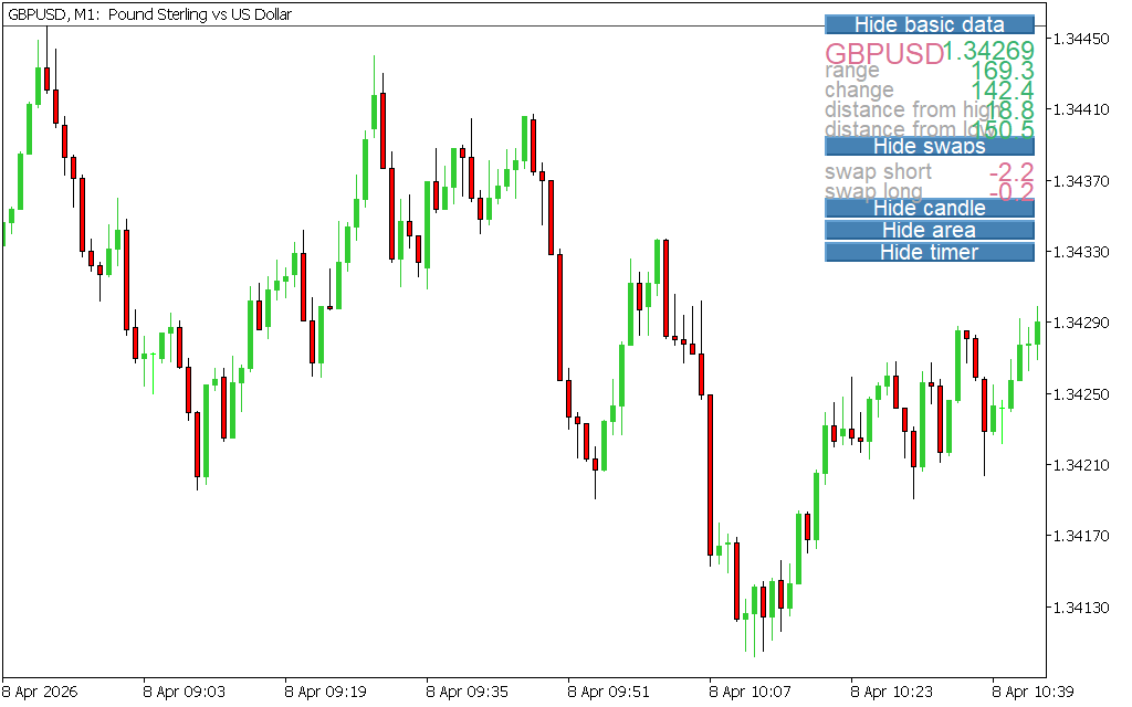 On the AUD/CHF H4 timeframe, the indicator shows spread, swaps, and distance from the high and low. It also draws a candle timer based on total price movement for the day, helping traders assess volatility and plan trades accordingly.