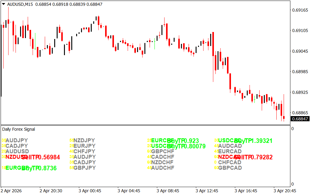 The Daily Forex Signal Indicator for MT4 is a powerful trading tool that provides buy and sell signals for 23 currency pairs. Built on a combination of popular technical indicators such as MACD, RSI, Stochastic, and Moving Averages, it generates reliable trading signals with included take-profit targets. This makes it suitable for both beginners and advanced traders who want a straightforward signal dashboard.