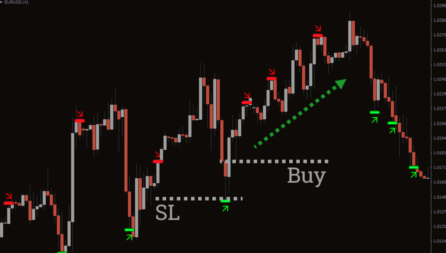 - Buy Signal – Appears when price rejects support and the indicator plots an upward arrow.