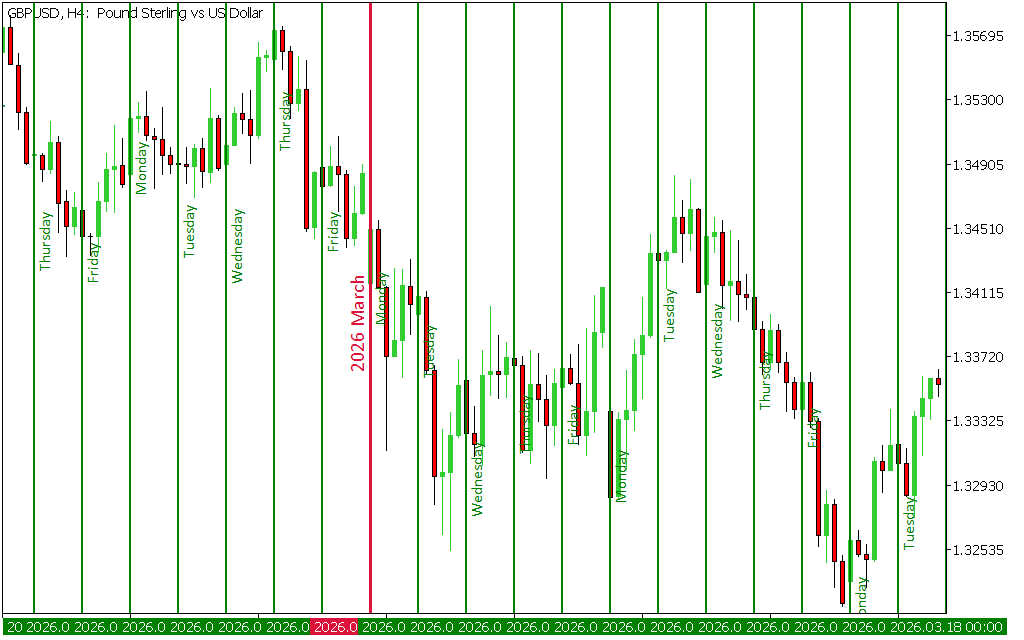 Once installed, the indicator displays vertical lines representing the start of each trading day. It automatically labels the current trading day and offers customization options for text and separators. This makes it easier to identify daily market behavior and test strategies using historical data.